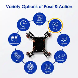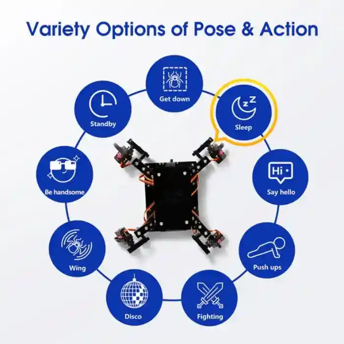 Mit der ACEBOTT-Mobil-App kann der Spinnenroboter in 6 Richtungen bewegt werden und 9 voreingestellte Aktionen ausführen: Standby, Liegen, Schlaf, Begrüßen, Push-up, Kämpfen, Tanzen, Swing und Handsome; sobald Kinder die Programmiermethoden beherrschen, können sie ihre eigenen DIY-Programme erstellen, um personalisierte Aktionen zu entwerfen, wodurch endlose Kreativität und Lernmöglichkeiten freigesetzt werden – SEO-optimiert, einheitliche ein-Satz-Beschreibung.