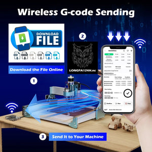Mit unserem WiFi-Modul und der App war das Herunterladen und Teilen von G-Code-Dateien noch nie so einfach. Greifen Sie auf Online-G-Code-Ressourcen zu oder teilen Sie Dateien mit Freunden, speichern Sie sie direkt auf Ihrem iPhone und senden Sie sie drahtlos an Ihre CNC-Maschine für eine nahtlose Ausführung.