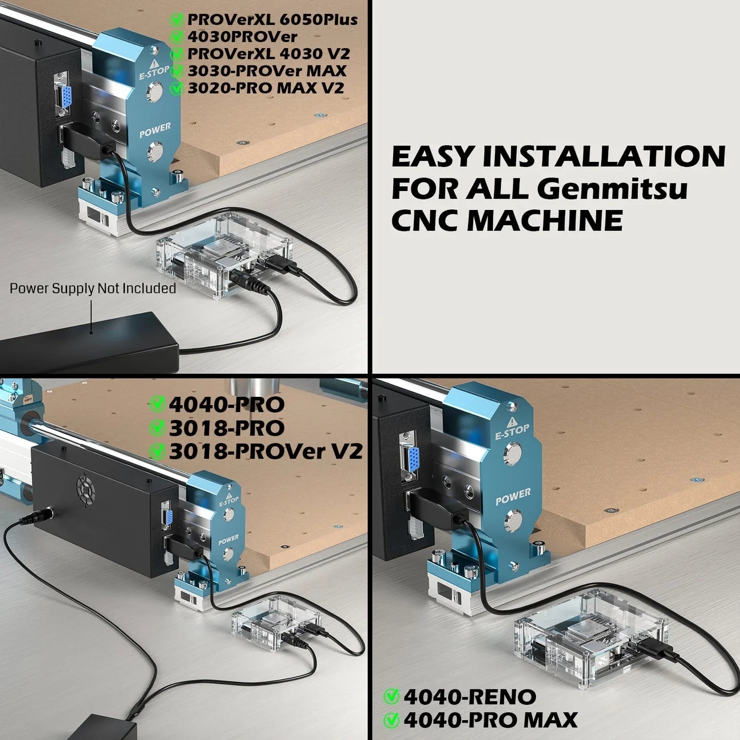 Die verbesserte USB-Schnittstelle in Kombination mit einem Dual-DC-Kabel gewährleistet die Kompatibilität mit allen derzeit verfügbaren Genmitsu- und den meisten CNC-Maschinen mit Grbl-Hauptplatine (mit CH34X-Chip USB zu Uart).