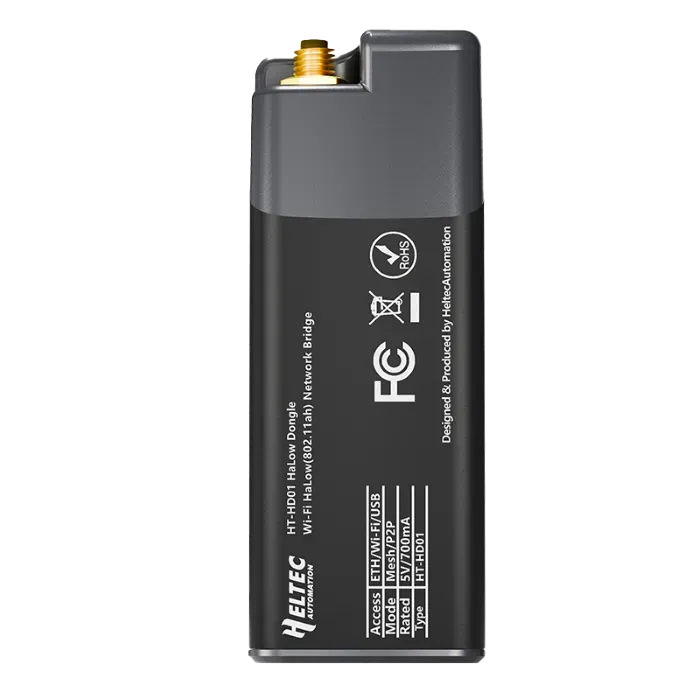Der Wi‑Fi HaLow Dongle (HT‑HD01) ist ein Langstrecken-Funkkommunikator nach IEEE 802.11ah im lizenzfreien SUB‑1G‑Band (902–928 MHz) mit 1/2/4/8 MHz Bandbreiten, bis zu 32,5 Mbps @ 8 MHz, Reichweite von über 1 km, Plug‑and‑Play‑Vorkonfiguration, USB‑Type‑C, Ethernet und 2,4 GHz Wi‑Fi, ideal für Industrieautomation, Smart Cities und IoT dank geringer Leistungsaufnahme, nahtlosen Punkt‑zu‑Punkt‑ oder Sternnetzwerk‑Verbindungen mit HT‑H7608 HaLow Router, robustem Aluminiumgehäuse und einfacher Montage.