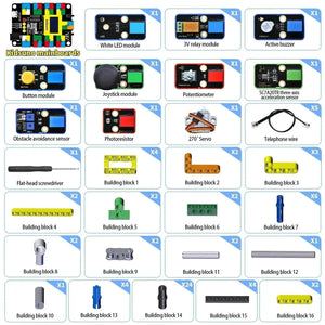 - Weißes LED-Modul, 3V-Relais, Taster, Summer, Hindernissensor, Fotowiderstand, Potentiometer, Joystick, SC7A20-Beschleunigungssensor, Servo