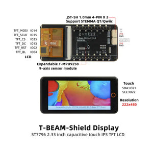 LILYGO T-Beam-Shield V1.0 ist ein hochauflösendes Touchscreen-Display-Modul, das für die nahtlose Integration mit LILYGO T-Beam-Entwicklungsboards entwickelt wurde. Es verfügt über ein 2,33-Zoll ST7796 IPS TFT LCD mit kapazitivem Touch und einer Auflösung von 222x480, bietet lebendige Bilder und reaktionsschnelle Eingaben für eine Vielzahl von IoT- und eingebetteten Systemanwendungen.
