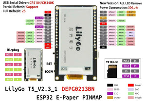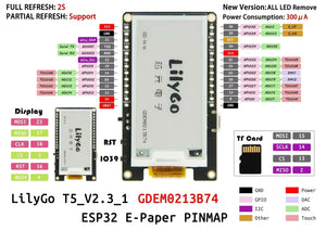 LILYGO T5 V2.3.1 ist ein ultrastromsparendes E-Paper-Modul mit 2,13" Display (212×104), ideal für Regaletiketten, Industrieanzeigen und IoT-Projekte. Dank SSD1680 Treiberchip, SPI-Schnittstelle, 180° Betrachtungswinkel und Betrieb im Temperaturbereich von -20 °C bis 60 °C zeigt es Inhalte auch ohne Strom dauerhaft an. Kompatibel mit Arduino-ESP32, inklusive Entwicklungsressourcen und Beispielcode.