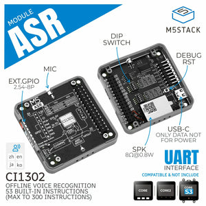 Das Module ASR ist ein intelligentes Offline-Sprachmodul, betrieben vom CI1302 Chip ⚡. Es verfügt über ein eingebautes Mikrofon 🎤 für kristallklare Audioaufnahme und einen Lautsprecher 🔊 für hochwertige Rückmeldungen.