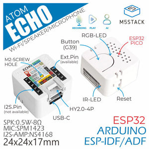 🔊 ATOM ECHO Smart Speaker Das ATOM ECHO ist ein kompakter Smart Speaker, der auf der M5ATOM-Plattform aufgebaut ist und beeindruckende Funktionen in einem kleinen Formfaktor von 24 × 24 × 17 mm bietet. Angetrieben vom ESP32 unterstützt es drahtloses Musik-Streaming über Bluetooth und gewährleistet zuverlässige Verbindungen mit Smartphones und Tablets.
