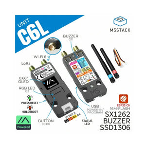 Unit C6L ist ein hochintegriertes LoRa®-Kommunikationsgerät, aufgebaut um das Stamp C6LoRa-Modul mit dem ESP32-C6 als Kerncontroller. Es integriert den SX1262 LoRa-Transceiver und RF-Schalterschaltungen und unterstützt einen weiten 868 ~ 923 MHz Frequenzbereich für robuste drahtlose Kommunikation. 📡