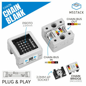 Der Chain Blank ist ein Proto-Board DIY-Erweiterungsknoten der M5Stack-Chain-Serie. Auf der Vorderseite befindet sich ein universelles 18 Ă 18âŻmm Prototyping-Feld đ§©, ideal zum Aufbau individueller Schaltungen. Im Inneren ist die Leiterplatte mit zwei miteinander verbundenen HY2.0â4PâSteckverbindern đ vorverlötet, was ein nahtloses Daisy-Chaining mit anderen GerĂ€ten der M5Stack-Chain-Serie ermöglicht â ohne deren ursprĂŒngliche FunktionalitĂ€t zu beeintrĂ€chtigen.