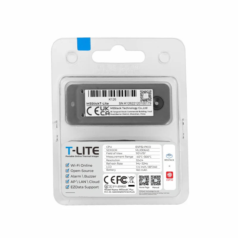 🔥 Wärmebildkamera für IoT & DIY — Die T‑Lite ist ein kompakter, integrierter M5Stack Wärmebild‑Temperaturmessgerät mit Online‑Erkennung und Echtzeit‑Visualisierung. Basierend auf M5StickC‑Plus + HAT THERMAL nutzt sie den MLX90640‑BAA Infrarotsensor für reaktionsschnelle Wärmebildkamera‑Aufnahmen. Die Hauptsteuerung erfolgt über den ESP32‑PICO‑D4 (Dual‑Core, WiFi), der ein 135 × 240 TFT‑Farbdisplay ansteuert und einen integrierten 160mAh Akku enthält. „T‑Lite“ = Temperatur (T) + Lite — kleine Größe, hohe Integration, bereit für M5Stack Projekte. ✅ Konfigurieren Sie eine Hochtemperatur‑Warnfunktion, streamen Sie Wärmebildkamera‑Bilder über Cloud und lokales Netzwerk in Echtzeit. M5 bietet eine Online‑Daten‑API (EZData), mit der Sie entfernte Bilder & Messwerte abrufen können — perfekt für Ingenieurwesen, Automatisierung und IoT Anwendungen. 🚀