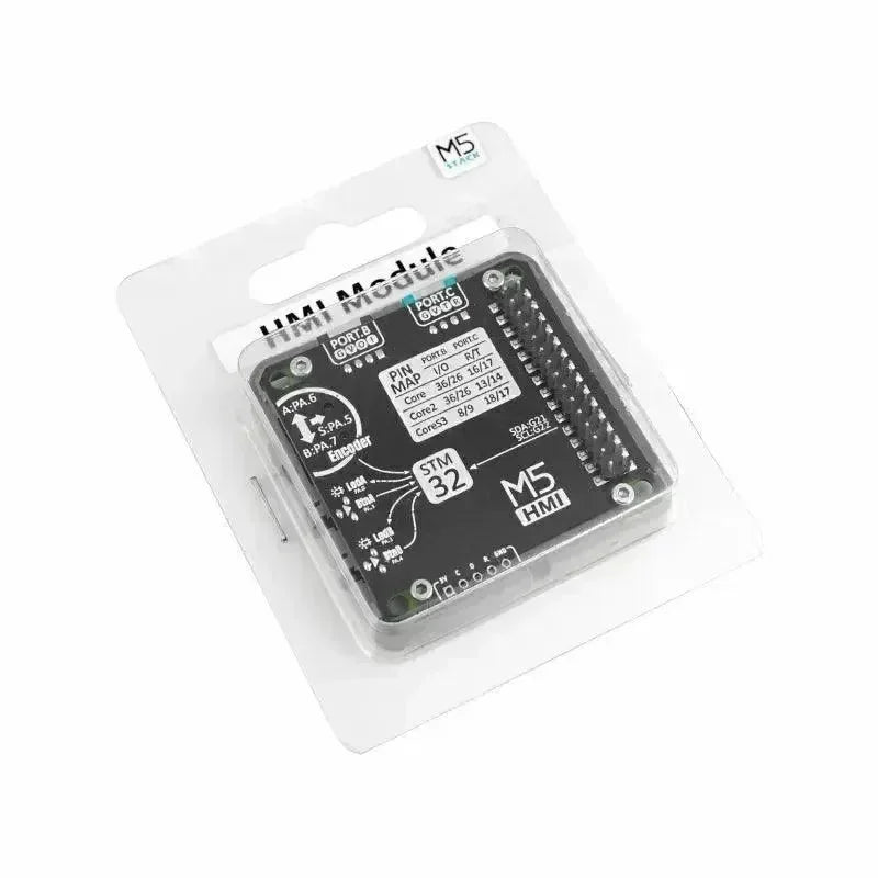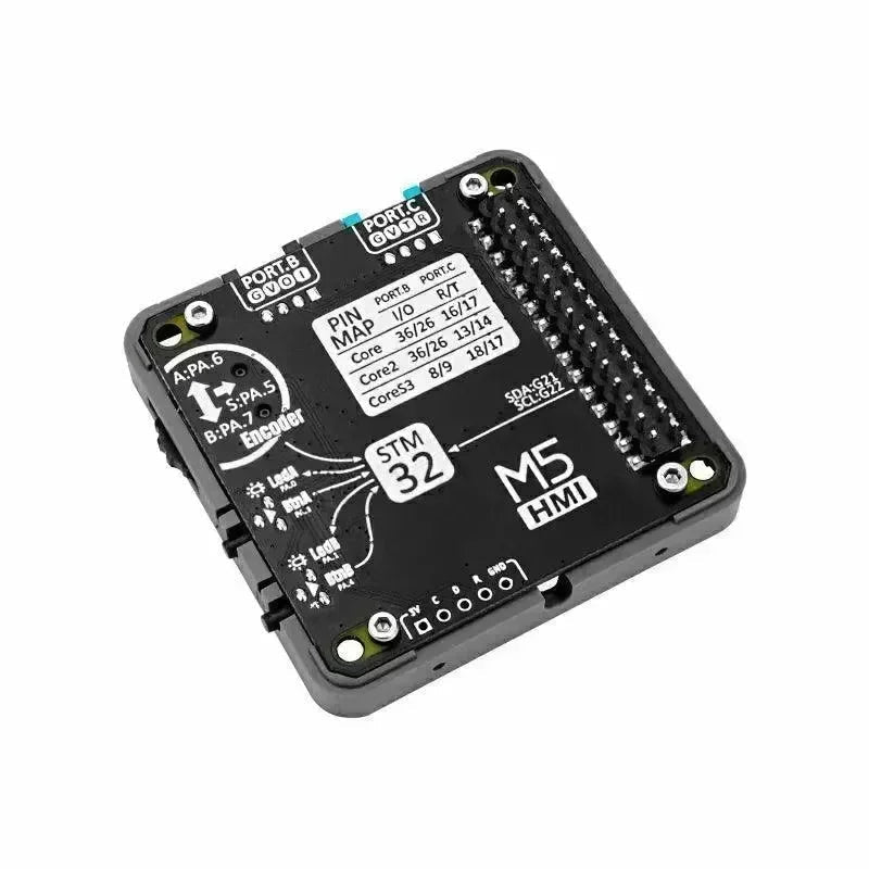 HMI-Modul als Mensch-Computer-Interaktionslösung: Drehgeber, zwei Eingabetasten und zwei LED-Anzeigen in Kombination mit dem STM32F030 als Erfassungs- und Kommunikations-Mikrocontroller; I2C-Kommunikation zum M5-Host, PortB- und PortC-Schnittstellen am Modul sowie ein eingebauter 500 mAh Lithium-Akku machen es ideal für tragbare Bediener-Interaktionen in Bildung, Prototyping, Robotik und Industrieautomation.