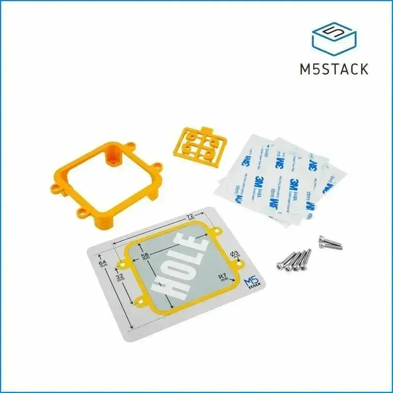 Panel Frame is a mounting frame designed for Core1, Core2, and Tough series M5Core devices. It provides two installation methods — using screws or double-sided adhesive tape. For M5Tough, 3M waterproof double-sided tape ensures a water-resistant installation. For M5Core (Core1/Core2), four plastic pads should be mounted at the four corners to keep the device surface parallel to the Panel Frame. Users can also customize hole cutting with the help of the included template card.