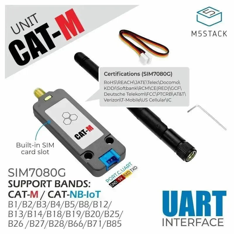 CatM Unit ist eine internationale Version eines drahtlosen Dual-Mode-Kommunikationsmoduls, basierend auf dem SIM7080G, das sowohl CAT-M (Kategorie M) als auch NB-IoT (Narrowband Internet of Things) unterstützt und damit zuverlässige IoT-Konnektivität weltweit sicherstellt. Die Dual-Mode-Fähigkeit ermöglicht nahtlose Verbindungen über verschiedene Mobilfunknetze und sorgt für globale Abdeckung in unterschiedlichsten Anwendungen.