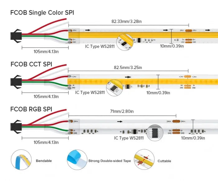 Entdecken Sie den vielseitigen WS2811 RGB LED-Streifen 💡, der 12W pro Meter liefert und wahlweise in DC12V oder DC24V erhältlich ist, mit einer schlanken Platinenbreite von 10 mm und flexibler Farbpalette: einfarbiges Warmweiß (3000K) 🌟, Neutralweiß (4000K) und Kaltweiß (6000K), duale Farbtemperaturen (2700K + 6500K) 🌈 sowie volles RGB für dynamische Lichteffekte, während die RGB-Pixeldichte bei 14 LEDs pro Meter liegt (ca. 630 LEDs pro Meter insgesamt) und einfarbige sowie duale Optionen 14 Pixel mit 360 bzw. 576 LEDs pro Meter bieten; Highlights wie 71 mm Lötpad-Abstand bei RGB-Modellen und 82,5 mm bei ein- und dualfarbigen Varianten erleichtern die Montage, während 1 m- und 2 m-Längen oft ohne Zubehör geliefert werden und 5 m-Konfigurationen typischerweise im Set enthalten sind – perfekt für Innen- und Außenbeleuchtung, Architektur- und Akzentbeleuchtung, Heimkino- oder Gaming-Setups sowie professionelle Installationen. 😊✨
