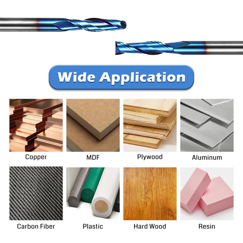 Geeignete Materialien: Geeignet für Aluminium, MDF, PVC, Acryl, Holz, Massivholz, Kohlefaser, Sperrholz usw. Weit verbreitet für Gravieren / Schnitzen / Nuten / Bohren / Aushöhlen / Fräsen.