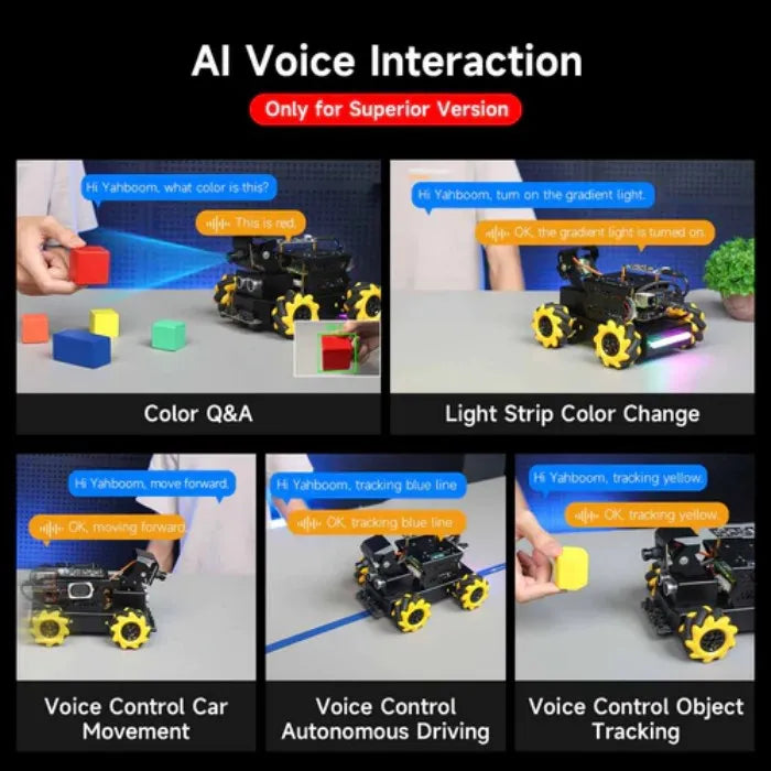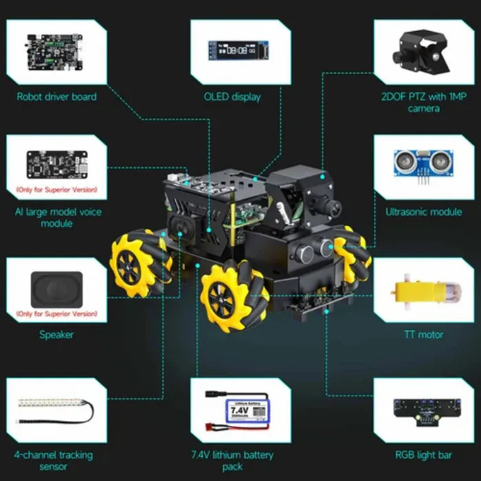 RASPBOT-V2 ist ein KI-Großmodell-Roboterauto mit einer robusten Metallgehäusehalterung und Mecanum-Rädern für 360° omnidirektionale Bewegungen. Als Hauptsteuerung dient Raspberry Pi 5 mit Python als Programmiersprache, ergänzt durch eine 1MP USB-Kamera und 2DOF PTZ; OpenCV und MediaPipe ermöglichen Farberkennung, Zielverfolgung, Kennzeichenerkennung, visuelles Tracking, Gesichtserkennung und Gestenerkennung. Yahboom liefert Zubehör wie einen 4-Kanal-Tracking-Sensor, Ultraschallsensor, OLED-Display, RGB-Lichtleiste sowie umfassende Software- und Hardwareunterstützung, die sich ideal für intelligentes Robotiklernen, KI-Entwicklung und Wettbewerbsprojekte eignen. RASPBOT-V2 richtet sich nicht nur an Einzelentwickler und Studierende, sondern wird auch in Bildung, wissenschaftlicher Forschung und Innovationsprojekten breit eingesetzt.