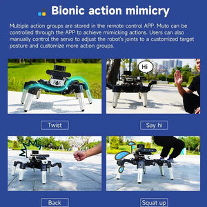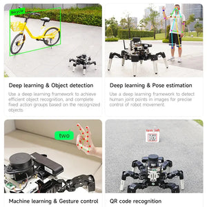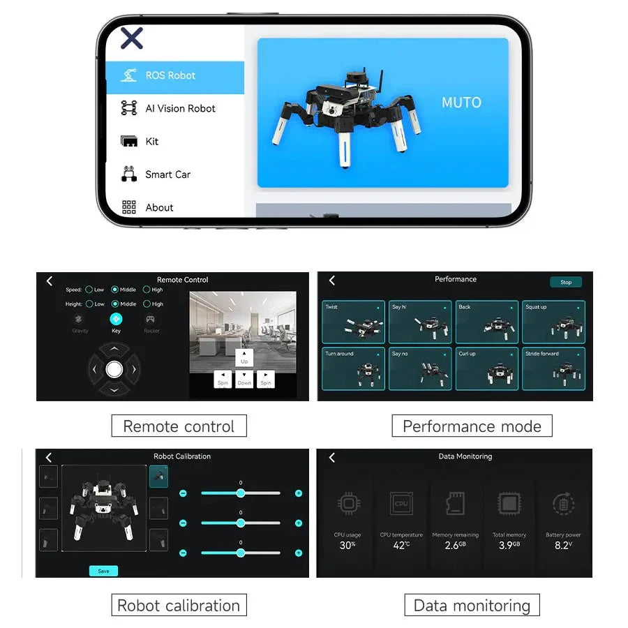 Durch Python3-Programmierung und integrierte hochpräzise inverse Kinematik-Algorithmen kann der Muto RS mühelos fortschrittliche Funktionen wie KI-visuelle Interaktion, 3D-Kartenavigation, Sprachinteraktion, Deep Learning und Rviz-Simulation implementieren. Durch die Nutzung der Multi-Maschinen-Kommunikationstechnologie kann der Muto auch die synchrone Steuerung und Navigation mehrerer Maschinen durchführen. Benutzer haben flexible Steuerungsoptionen über eine spezielle APP, einen drahtlosen Controller oder Computer-Webseiten. Der Muto ist nicht nur eine ausgezeichnete Plattform zum Erlernen von Algorithmen für die Bewegung von mehrbeinigen bionischen Robotern, sondern auch ein robustes Werkzeug für ROS-Entwickler.