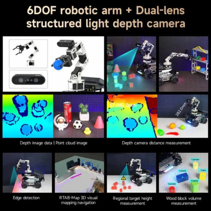 - In combination with a depth camera and a 6DOF robotic arm, enabling 3D grasping, precise handling, and MoveIt simulation. Four TOF ranging LiDARs front left and rear right provide 360° scanning, improving mapping and navigation accuracy.