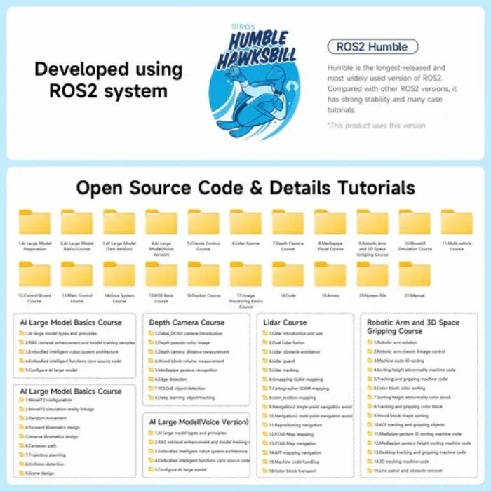 - Based on ROS2 Humble, compatible with a variety of robotics algorithms and AI course content.