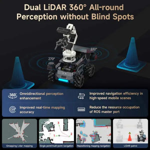 - In Kombination mit einer Tiefenkamera und einem 6DOF-Roboterarm ermöglichen sich 3D-Greifen, präzises Handling und MoveIt-Simulation. Vier TOF-Entfernungslidar vorne links und hinten rechts bieten 360°-Scan, verbessern Mapping und Navigationsgenauigkeit.