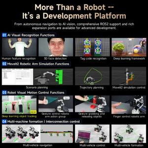 - Basierend auf ROS2 Humble, kompatibel mit einer Vielzahl von Robotik-Algorithmen und AI-Kursinhalten.