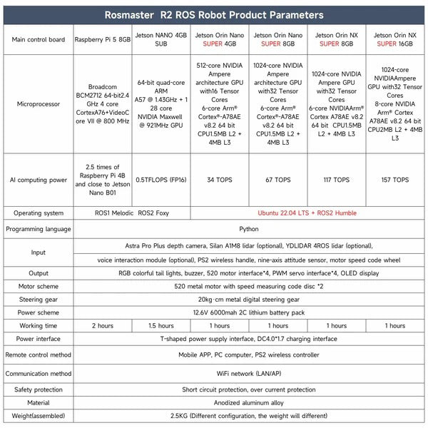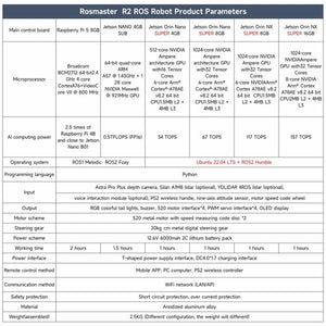 Der ROSMASTER R2 ist ein fortschrittlicher mobiler Roboter mit einem KI-Sprachinteraktionsmodul und Ackermann-Lenkstruktur, der auf dem ROS2-System basiert. Er ist kompatibel mit Jetson NANO (B01/SUB), Jetson Orin NANO SUPER, Jetson Orin NX SUPER und Raspberry Pi 5 als Hauptsteuerplatinen.